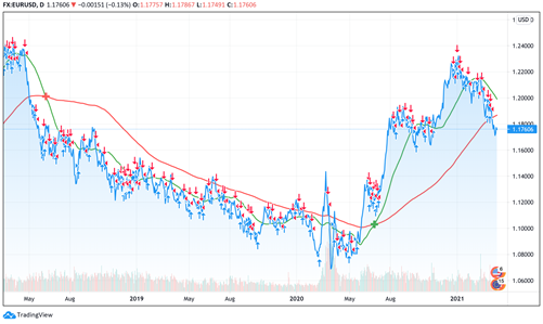 Taking the 50/200 as an example, if the 50 has crossed over the 200 and is now higher, then the current trend is positive and it’s a good time to get in. In the chart above, this has only happened one time for the EURUSD currency pair in the last 3 years: July 2020.